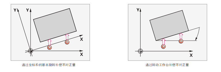 通過觸測工件的棱邊兩點(diǎn)精確檢測出工件的偏斜誤差,根據(jù)不同的機(jī)床設(shè)備,在數(shù)控系統(tǒng)中旋轉(zhuǎn)工件坐標(biāo)系,或者旋轉(zhuǎn)工作臺(tái)來補(bǔ)償偏斜誤差。